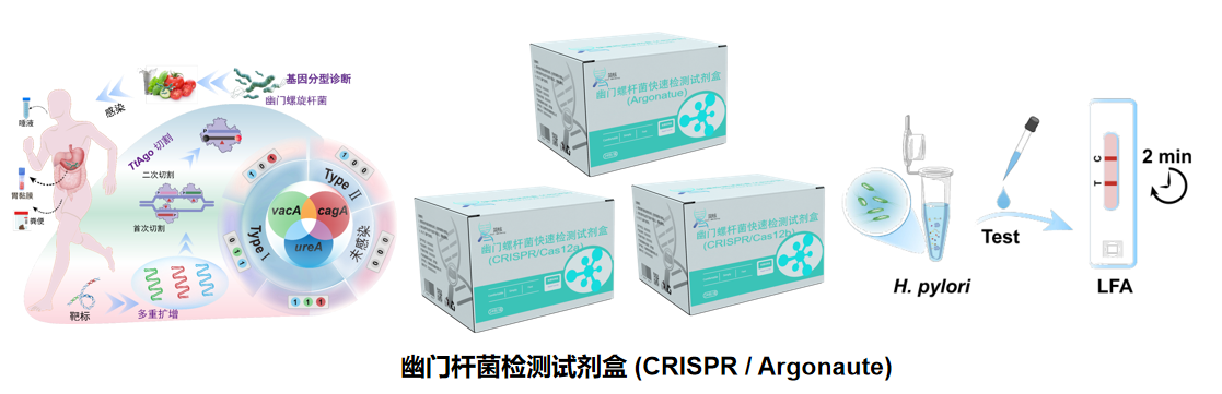 幽门螺杆菌是一种螺旋形细菌,革兰氏阴性病原体,广泛存在于人类胃黏膜中它是感染胃癌的关键因素。在所有胃癌病例中,60%发生在东亚地区,仅中国就占43.9%。根据世界卫生组织癌症国际研究的数据,到2040年,胃癌的年度负担将增加到约180万例新病例和130万例死亡病例。在此,开发基于可编程核酸酶CRISPR/Cas12a和Argonaute结合等温扩增LAMP快速检测试剂盒,并结合胶体金试纸条检测幽门螺杆菌特异基因和特定耐药基因靶点,可以在15 min内对大量样本进行高效的分析,有极高的特异性和准确性。
