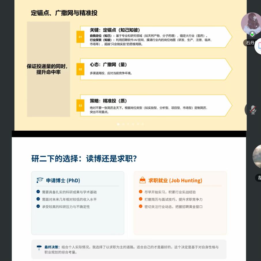 胡晨龙、石丹丹校友目前分别就职于康希诺生物股份有限公司、华润双鹤药业股份有限公司,两位校友毕业时均斩获5个以上优质offer,如今已成长为部门负责人,具备丰富的研发、管理与人才选拔经验。分享会上,他们结合生物医药行业特点与自身成长历程,围绕研发岗、质量岗、注册岗等核心岗位面试技巧、GMP合规意识、科研成果转化、职场沟通与团队协作等内容,细致讲解简历打磨、专业问答、压力面试应对等实用干货,针对性解答生物医药企业用人标准与职业发展路径。自由交流环节,同学们就求职方向选择、实习规划、行业前景等问题踊跃提问,互动氛围热烈。